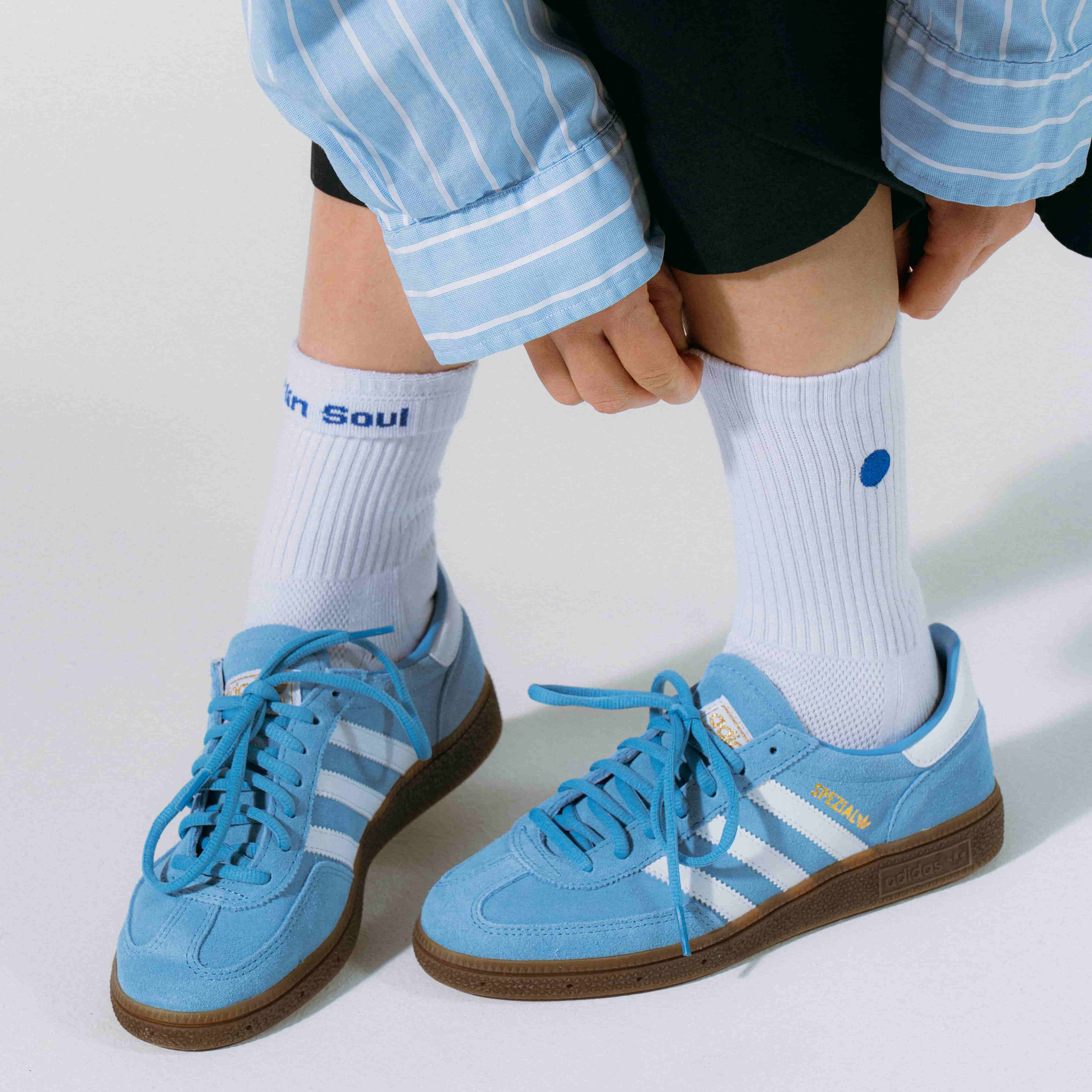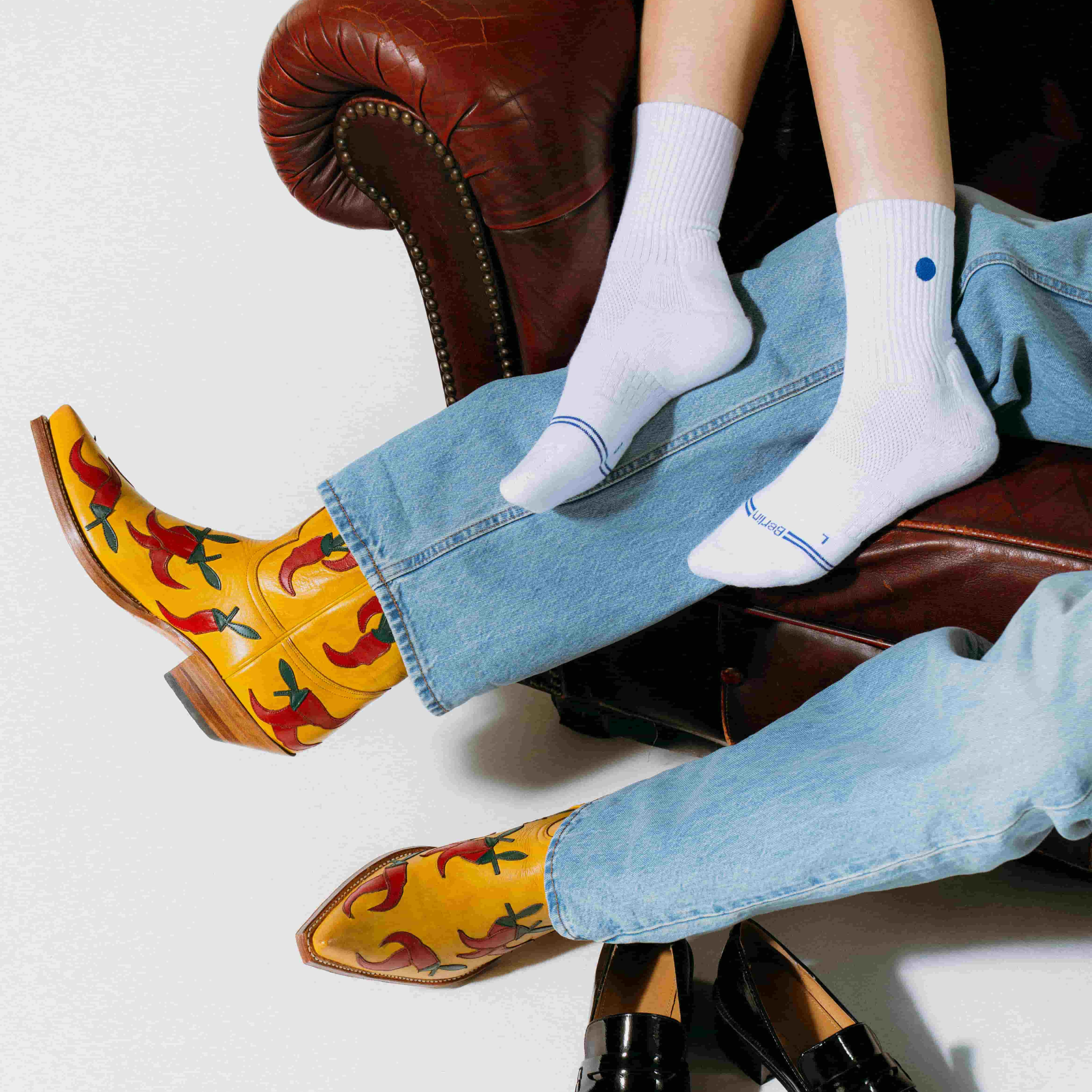 Das Fersenpolster schützt vor Reibung, der verstärkte Zehenbereich gibt extra Komfort. Atmungsaktive Bio-Baumwolle hält deine Füße trocken – auch nach Stunden tanzen. Zwei Farben, dezente Akzente. Berlin-Soul am Saum, sichtbar wenn du ihn umschlägst.
